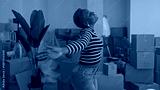 Young woman stretches arms and smiles broadly amid stacked cardboard boxes in a spacious building; optimism.