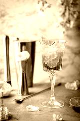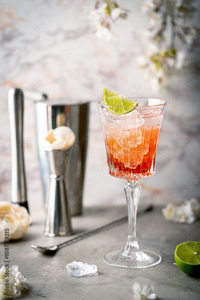 Bright orange drink in a glass with ice and lime. Aperol Spritz cocktail decorated with flowers on light background.