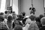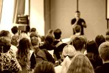 Presenter at front of room engaging crowd during seminar audience listening closely conference setting