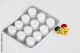 Blister pack of white round tablets alongside colorful gel capsules in red, green, and yellow on a clean white surface