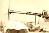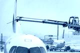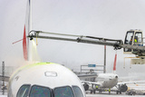 De-icing An Aircraft On The Ground With An Elevated Arm In Snow At The Airport