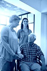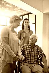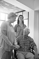 Discussion, nurse and senior man in wheelchair for checkup with support, empathy or service. Couple, medical help and healthcare worker with elderly male patient with disability for consultation.