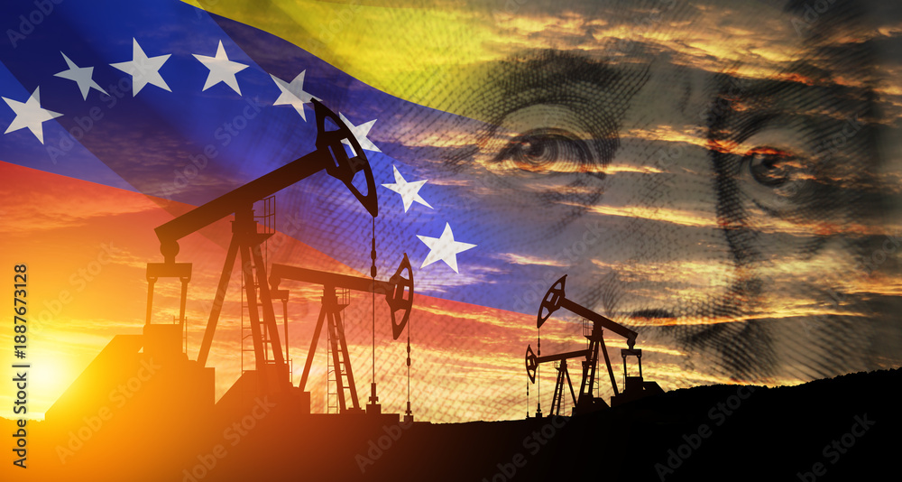 The change in oil prices. Oil price cap concept. Oil drilling derricks at desert oilfield. Oil pump on background of US dollar and Venezuela flag. Petroleum production.