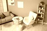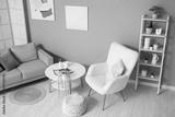Interior of living room with table, sofa and soft armchair near green wall