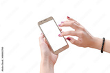 Isolated smart phone in woman hands. Woman touch mobile phone screen. White blank screen for mockup.