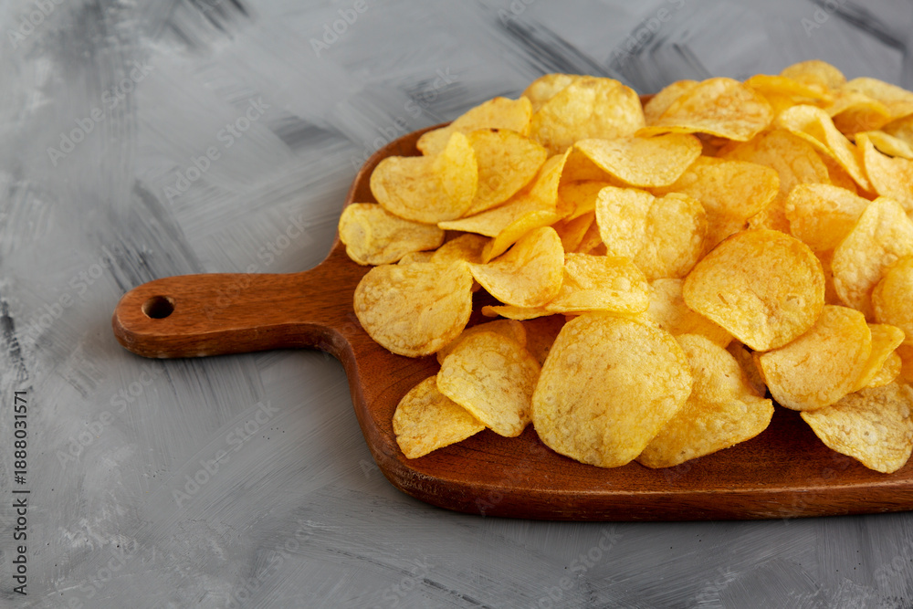 Crispy Potato Chips with Bacon Flavor on a Wooden Board, side view.