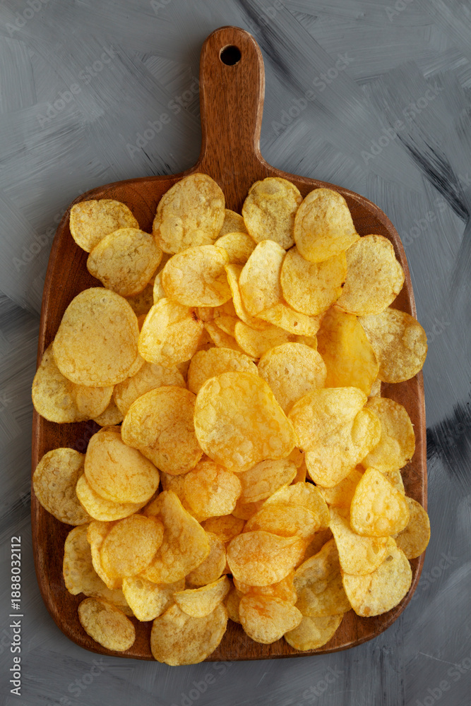 Crispy Potato Chips with Bacon Flavor on a Wooden Board, top view.