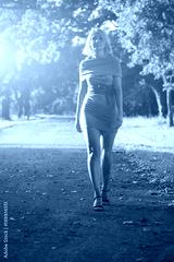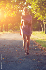 Portrait of fashionable young sensual blonde woman in garden enyoing on the grass field at sunset.