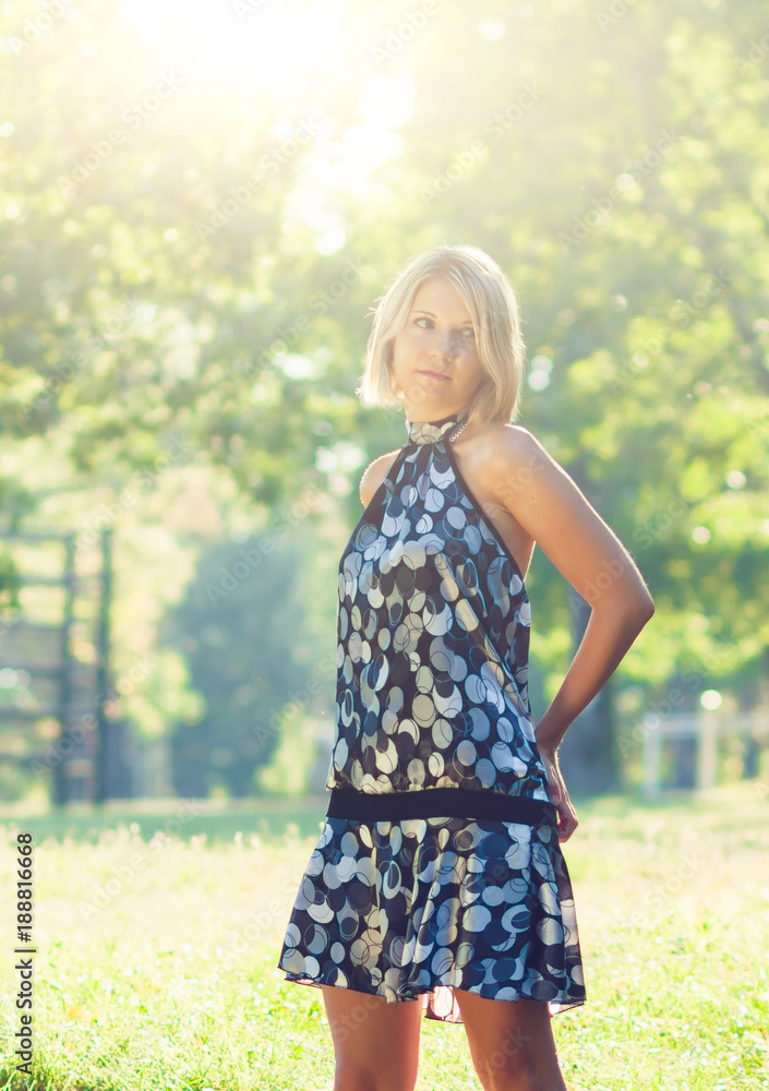 Portrait of fashionable young sensual blonde woman in garden enyoing on the grass field.