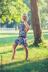 Portrait of fashionable young sensual blonde woman in garden enyoing on the grass field.