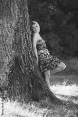 Portrait of fashionable young sensual blonde woman in garden lean on the tree.