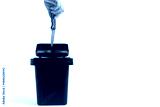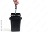Hand dropping an open folding knife into trash bin, symbolizing peace or disarmament.