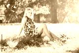 Portrait of fashionable young sensual blonde woman in garden sitting on the grass.