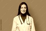 Portrait of serious female doctor in white lab coat with stethoscope on gray background