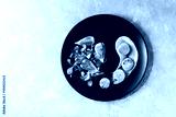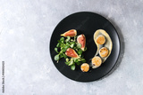Fried scallops with lemon, figs, sauce and green salad served on black plate over gray texture background. Top view, copy space. Plating, fine dining