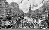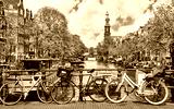 Bike over canal Amsterdam city. Picturesque town landscape