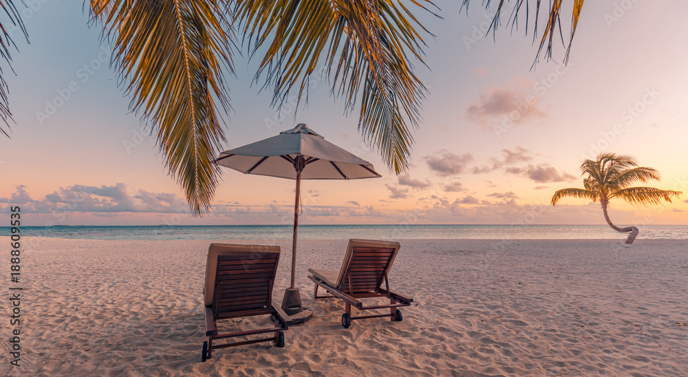Sunset tropical beach with beds and umbrella, palm leaves, popular honeymoon travel destination, relaxing tropical nature landscape, vacation resort, tropical paradise