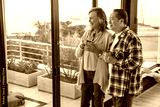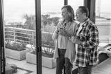 Diverse senior couple standing by sliding doors on balcony holding mugs and watching ocean