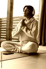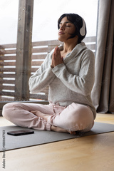 Adult asian woman meditating on yoga mat by glass door with smartphone and headphones