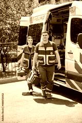Two paramedics demonstrating AED beside ambulance