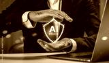 Businessman holding virtual AI ethics shield with his hands symbolizing protection of artificial intelligence responsibility and transparency concept.