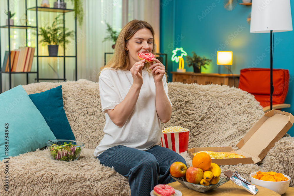 Pregnant middle-aged woman at home looks at pizza chocolate fruit chips popcorn eyes wide belly grumbles craving big feast. Caucasian girl on sofa plans small bites to calm hunger and keep baby safe.
