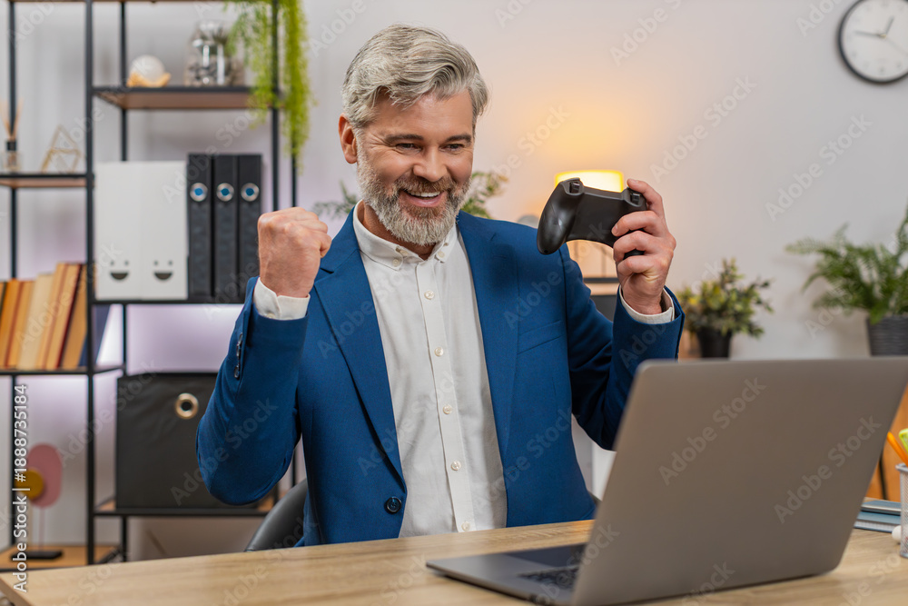 Middle-aged businessman at home office lifts joystick skyward after laptop game victory cheering loudly. Freelancer guy at table laughs thrilled checking score and planning next gaming challenge soon.