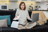 Young woman at home reviews family finance documents on laptop sees utility bills high fees feels worry. Caucasian girl on sofa looks at camera seeks help about charges opens bank app and notes issue