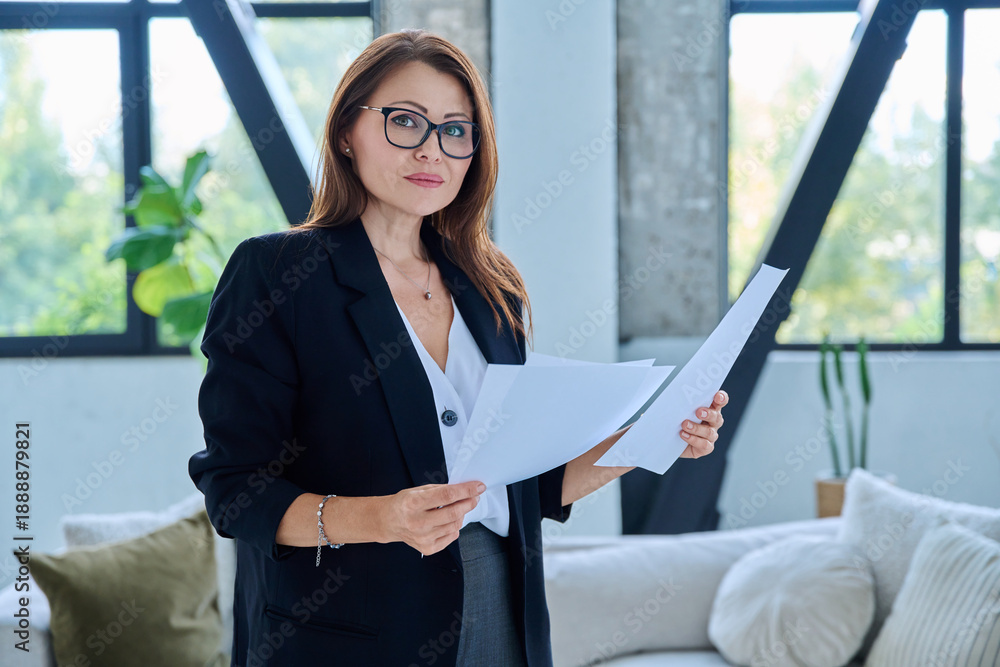 Portrait of middle-aged confident businesswoman with business papers
