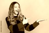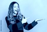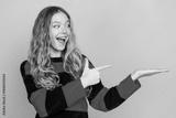 Excited young woman in casual striped sweater pointing and smiling with cheerful expression on vibrant yellow background