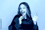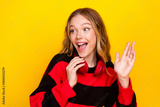 Adorable young woman in striped sweater with headphones posing cheerfully against bright yellow background