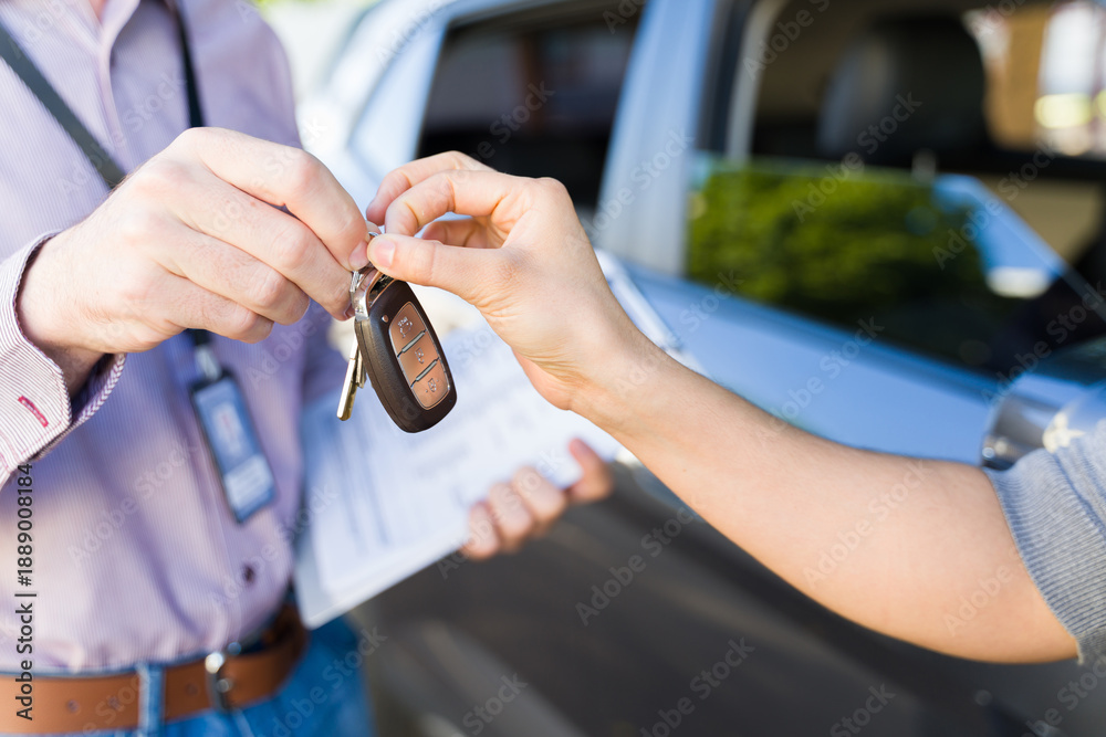 Closeup of driving instructor handing car keys to adult learner after lesson, emphasizing independence and vehicle access