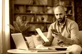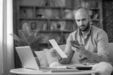 Man stressed at home table holding a bill and smartphone, laptop open as he calculates monthly expenses and manages personal finances with paperwork and worried focus