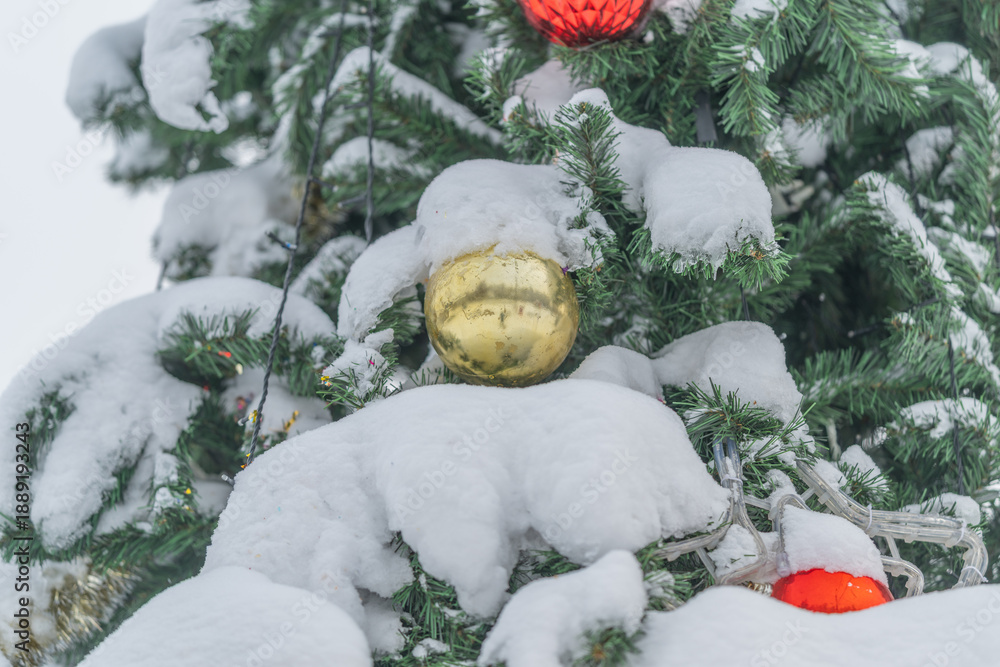Peaceful snowy scene featuring bright Christmas tree and sparkling decorations, Tranquil winter vista displaying decorated fir amidst snow and shimmering holiday ornaments