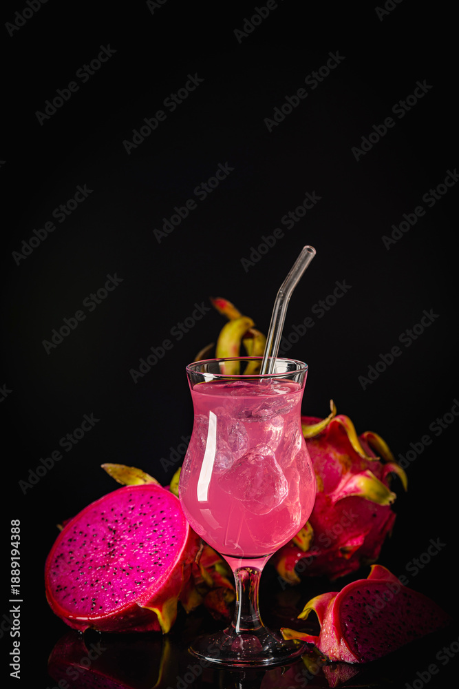 Glass of tasty pitahaya cocktail and fresh dragon fruits on dark background