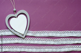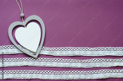 Card with heart shaped pendant for banner design. Card with pendant on red backdrop with lace ribbon. Romantic day concept. Valentine heart card design