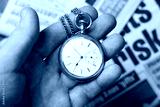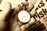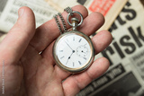 A person holds a vintage pocket watch in their hand. The watch has a white face and silver chain. Behind is a newspaper showing the word risk among other printed text.