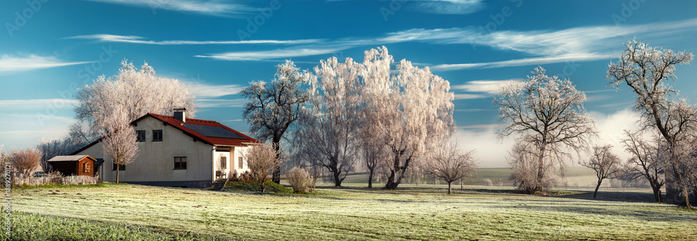 Rural home in magical frozen landscape. Panoramic winter wonderland view with a house, blue sky and hoarfrost on trees and meadow