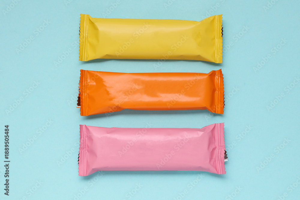 Chocolate bar packs mockup on blue background. Blank colored candy wrappers