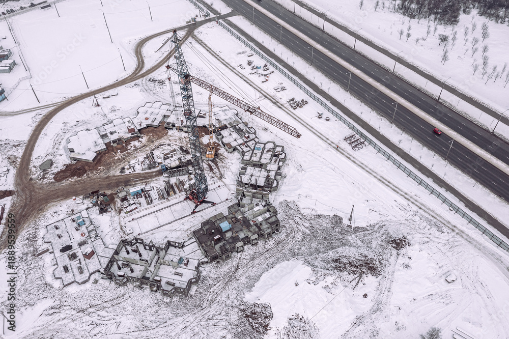 construction of new building in suburb residential area at winter time. aerial view.