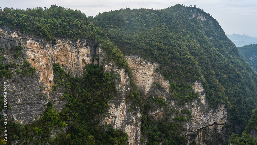Picturesque mountains. There is green vegetation and forest on the steep slopes and cliff tops. Details of the Grand Canyon landscape. Wulingyuan. China. View from the Zhangjiajie Glass Bridge