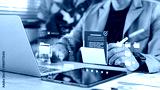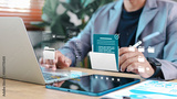 Business professional managing digital documents and folders on tablet and laptop with secure file icons. Concept of document management system, data security, and workflow automation.