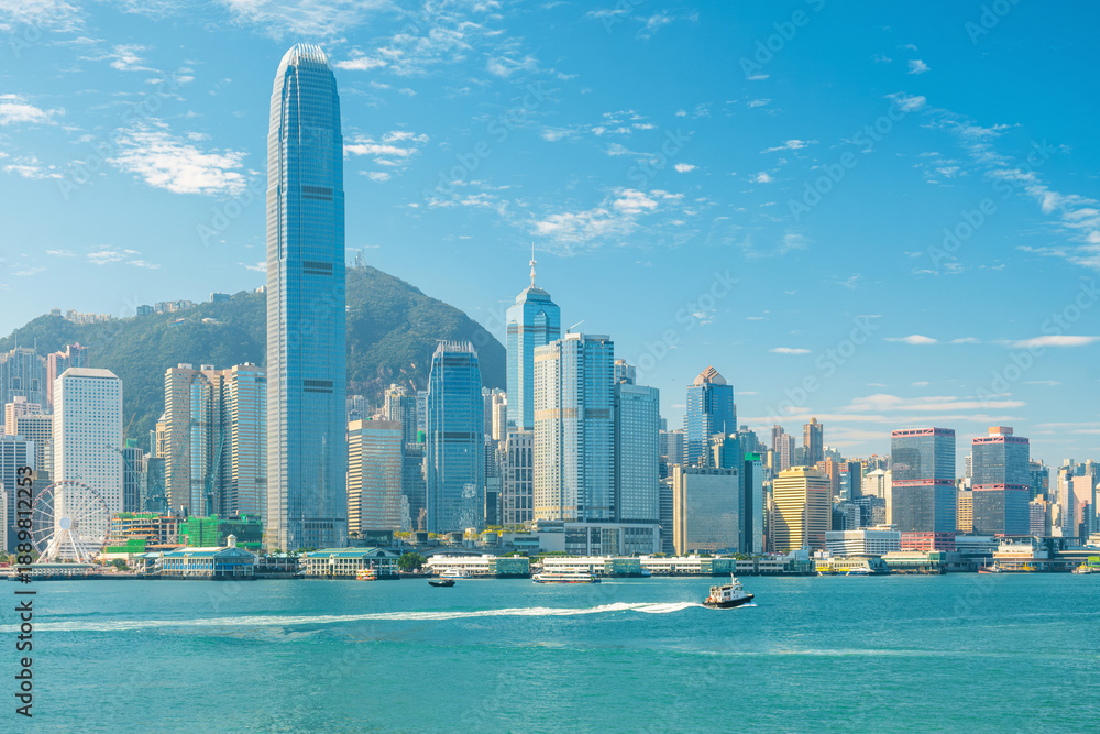 View of Hong Kong city skyline along Victoria Harbour with skyscrapers, modern office towers and buildings, China. Global city, financial district, urban development, international business