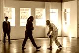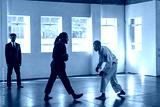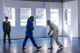 African american coach and students engaging in sparring on mats wearing gis near windows