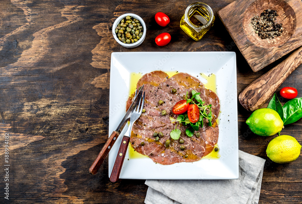 Raw BEEF CARPACCIO on white plate, wooden background, top view, copy space