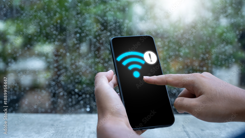Close-up of hands holding a mobile phone showing a Wi-Fi error symbol against a rainy window background. Concept of bad internet connection and signal problems