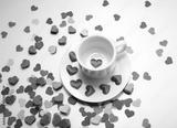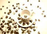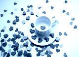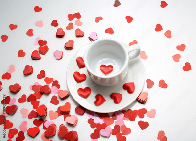 cup of tea ,full of heart with i love you words on the spread of small heart, white and red background