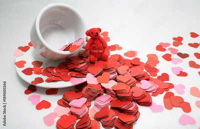 cup of tea ,full of heart with i love you words on the spread of small heart, white and red background