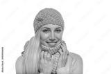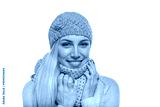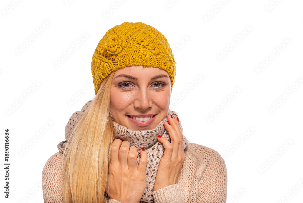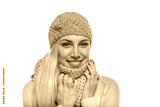 A smiling blonde woman wearing a yellow knit hat and a beige patterned scarf poses against a white background.