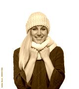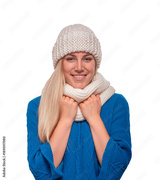 A smiling young woman with long blonde hair wears a white knit beanie, a matching scarf, and a blue sweater against a plain white background.